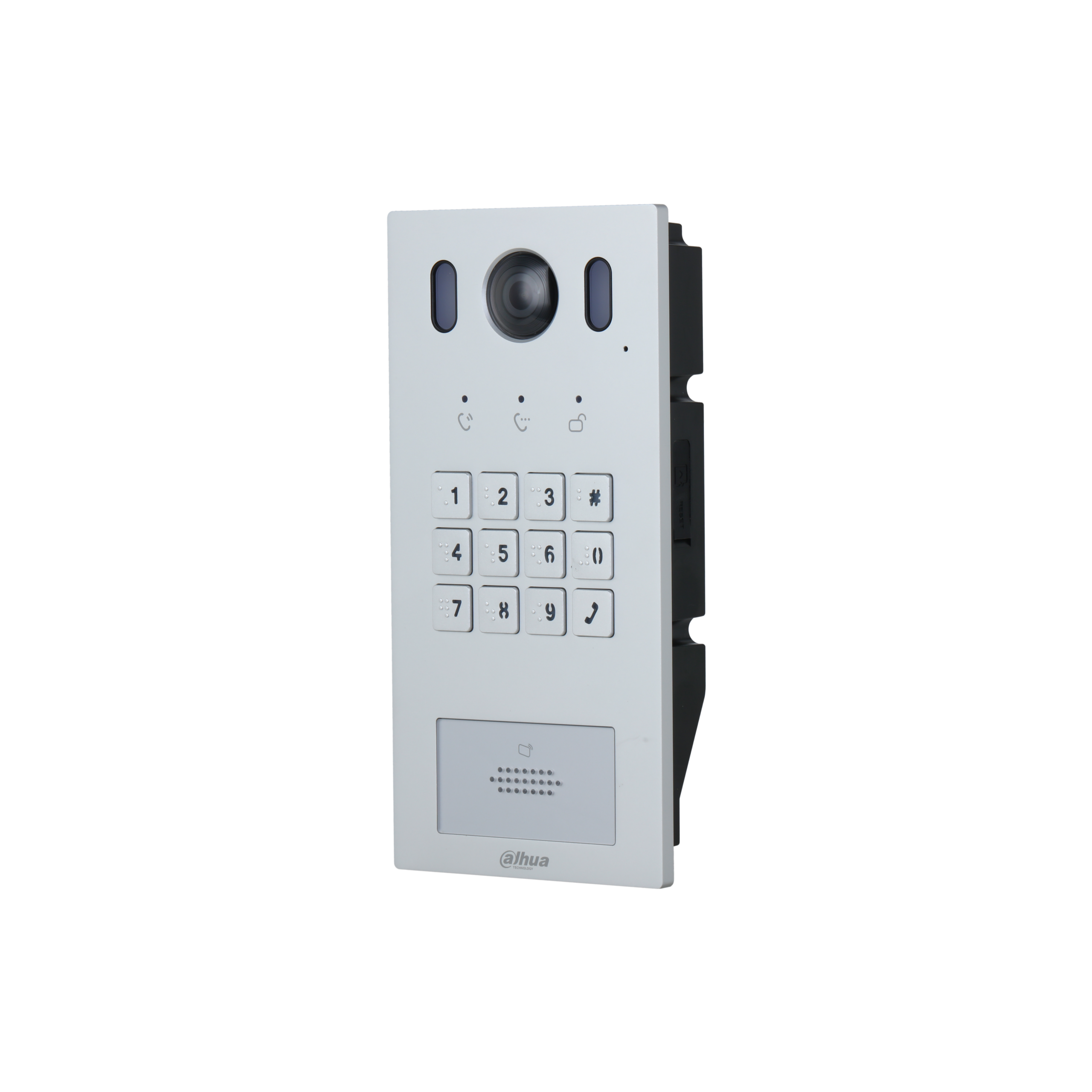 Keyboard Villa Door station. Supplemental Lighting with White Light. 2MP CMOS Camera. Mechanical Button with Braille. Aluminium Alloy plate, IK08, IP55. (Apply Silica Gel to Gaps between the Device and the Wall. Liquid Sodium Silicate is recommended. For details, see the quick start guide.) Door release via password and Mifare Card.